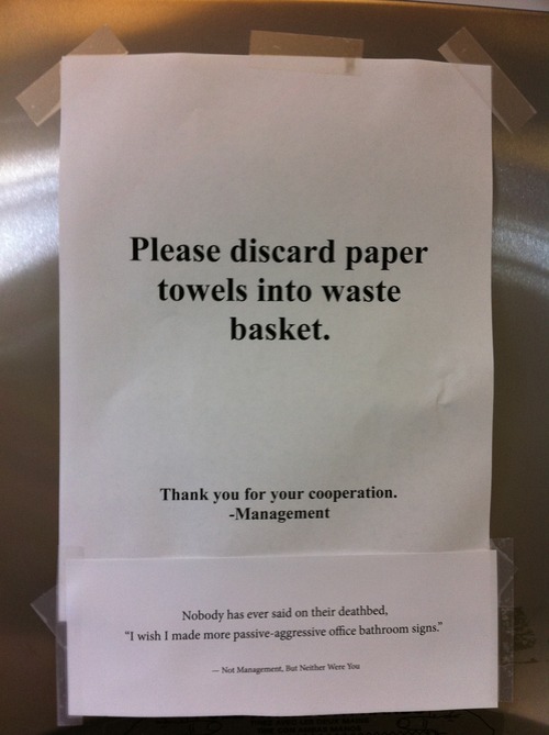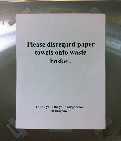In this case, someone else on the same floor as the Tumblr office put up this sign in the bathroom: