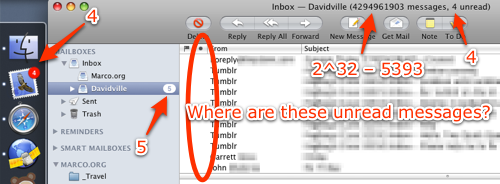I love Mail.app and this buggy IMAP account. I apparently have 5 unread messages somewhere. Or is it 4? Or maybe it’s 2^32 - 5393? Regardless, I can’t find them anywhere.