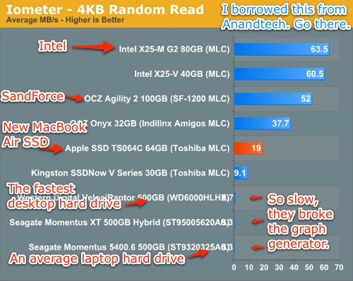 I had low hopes for the new Air’s Apple-branded, Toshiba-controlled SSD, but it’s actually pretty decent — and compared to SSDs used by Apple in the past, it’s great. It’s nowhere near an Intel or SandForce SSD (hey), but it’s still much faster than hard drives and most “bad” SSDs.