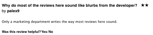 This feature bothers me because it will unfairly bias reviews to be negative. It’s the only time where Apple interrupts you and strongly encourages you to tap a star rating, and it’s doing so at a time that’s likely to be negative and fleeting, and without any text for the user to explain the rating.
