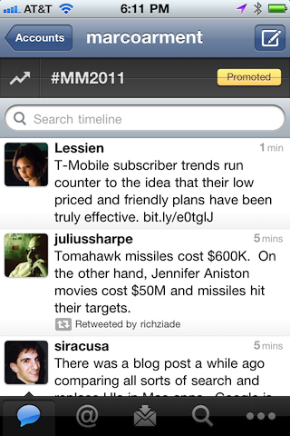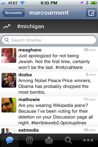 And in the context of this app, most of which was carefully and thoughtfully constructed by Loren Brichter before Twitter bought it from him, we’re accustomed to Brichter’s even higher standards, which won Tweetie an Apple Design Award in 2009. (I suspect he had little to no authority in the Quick Bar’s existence, design, or placement, and it’s probably killing him inside.)