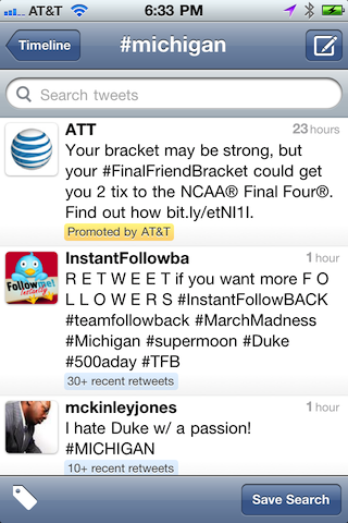 I see, from top to bottom: intentional spam, unintentional spam, and a random person’s frivolous, meaningless tweet about sports that I don’t care about. (I scrolled down and it only got worse.) I guess Michigan is a trending topic because something important happened with a Michigan sports team.