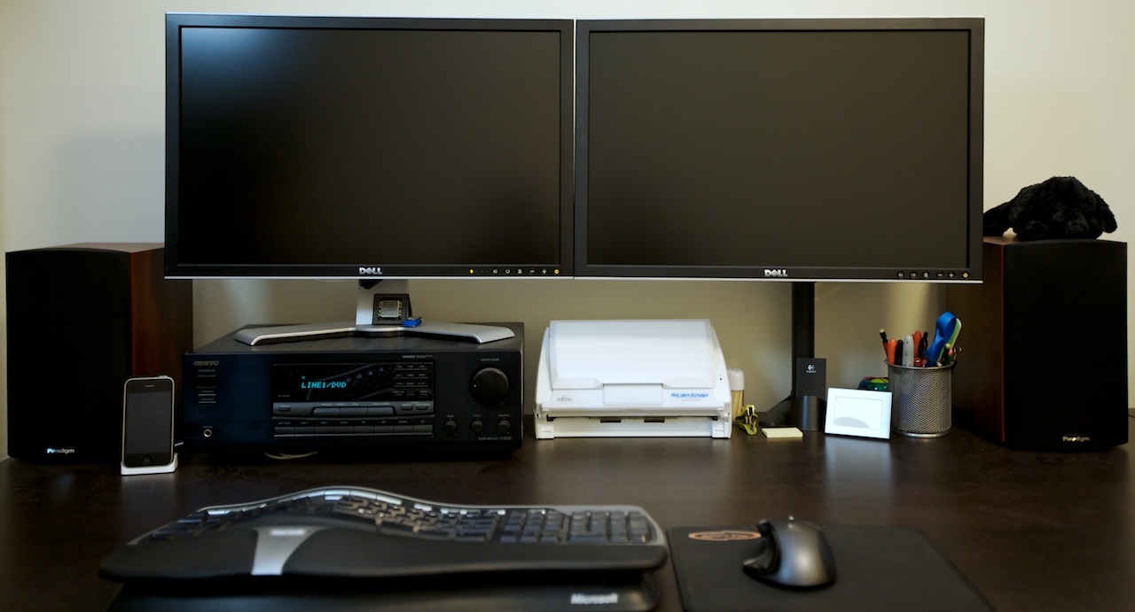Adam’s ode to his favorite computer speakers inspired me to finally post a photo of my new desk setup.
