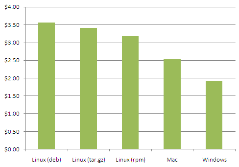 World of Goo’s pay-what-you-want report has some great statistics about the average prices people paid. This one was surprising: I expected Windows users to be the cheapest, but I didn’t expect Linux users to be the most generous.