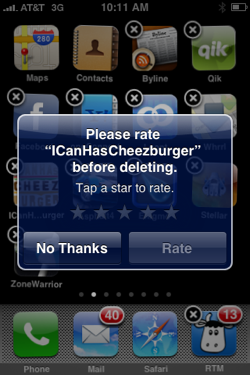 Fewer than 2% of frequent users of Instapaper Free have left ratings, but it has a good 4-star average. (Instapaper Pro is 4.5 stars, which is pretty lucky since it’s a $9.99 app that was released before reviewers were required to have purchased the app.) If everyone who deleted them was aggressively encouraged to rate it with this dialog, my rating would probably be horrible. Everyone’s would.