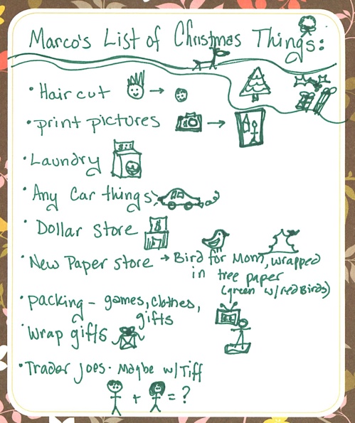 Spousal to-do lists are so much easier when illustrated with descriptive stick drawings. (By Tiff, of course.)