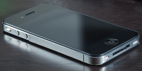 After peeling out the pre-cut sections of film for the front and/or rear, you’re left with a border that’s exactly the width of the iPhone 4’s steel sides. I applied this strip to this side, then applied a second one to the opposite side of the phone, going right over the SIM tray (if I ever need to get to it, I’ll peel off the film) and stopping just short of the sleep/wake button.