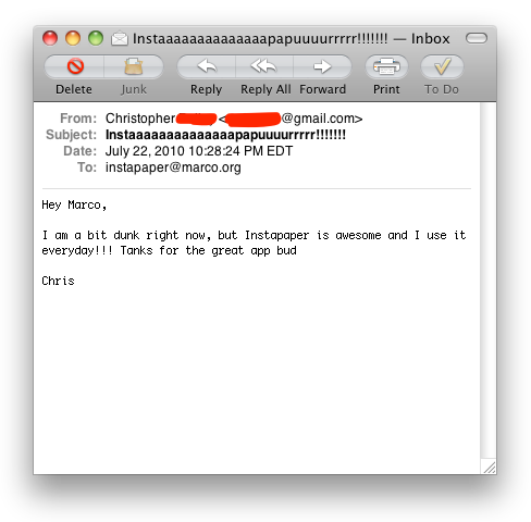 - “I would like to enter a business relationship with Instapaper. I might even be credible. Here is a giant wall of text explaining why I believe this is a great idea. When can you meet me in person this week to talk about this and engage my services, take my money, or hire me?”