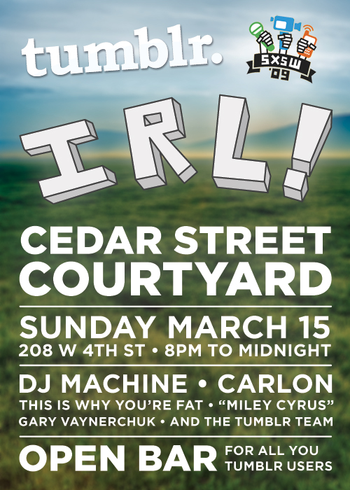Come join us at South by Southwest for the biggest party we’ve ever thrown! We’ve booked the Cedar Street Courtyard this Sunday from 8:00 on, with special guests and open bar for anyone with a tumblelog.