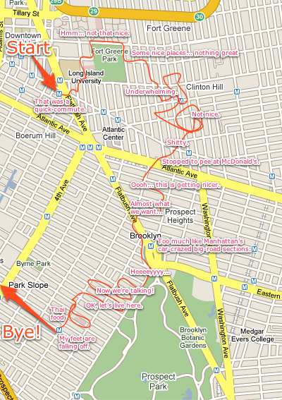 We‘re thinking about moving to Brooklyn, but we don’t know much about it, so we took a quick tour of some neighborhoods that our friends had recommended and looked nice from Craigslist: Fort Greene, Clinton Hill, Prospect Heights, and Park Slope.